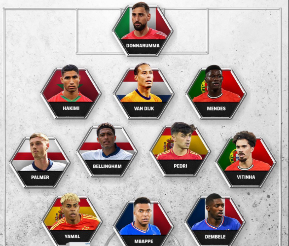 الوسط: البرتغالي فينتينيا (باريس سان جيرمان) – الإسباني بيدري (برشلونة) – الإنجليزي جود بيلينجهام (ريال مدريد) – الإنجليزي كول بالمر (تشيلسي).