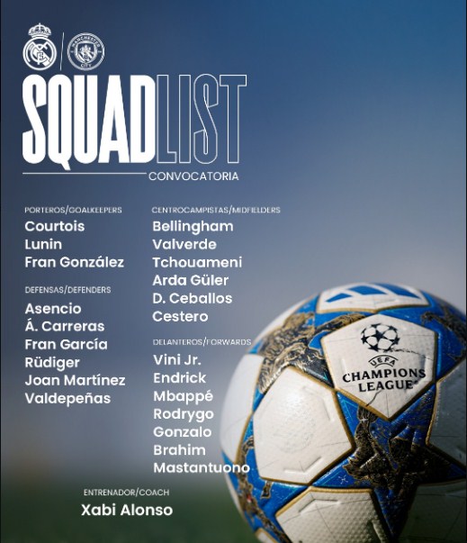 أعلن تشابي ألونسو، المدير الفني لفريق ريال مدريد، قائمة النادي الملكي استعدادًا لمواجهة مانشستر سيتي الإنجليزي ضمن الجولة السادسة من مرحلة المجموعات بدوري أبطال أوروبا.