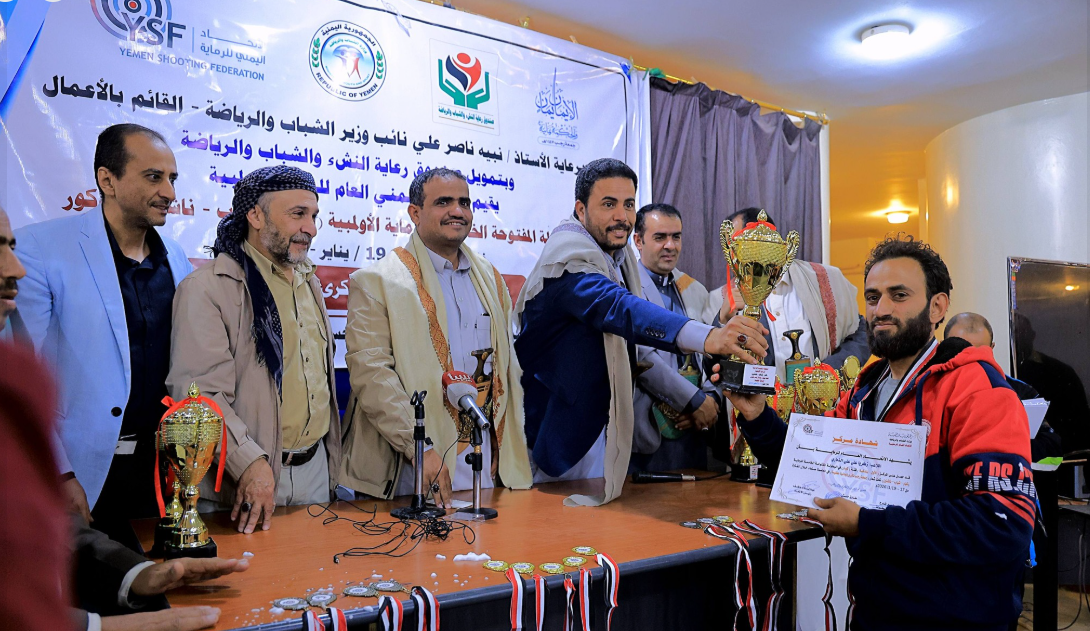 كرَّم نائب وزير الشباب والرياضة- القائم بأعمال الوزير، نبيه ناصر علي، ومعه وكيل قطاع الرياضة علي هضبان، والوكيلان المساعدان الدكتور كمال الشريف وطارق حنش، ورئيس الاتحاد العام للرماية عبدالسلام عاطف، اليوم بصنعاء، الفائزين في البطولة المفتوحة الخامسة للرماية الأولمبية في سلاحي المسدس والبندقية (ضغط الهواء) لفئة الذكور (كبار، شباب، ناشئين، براعم).