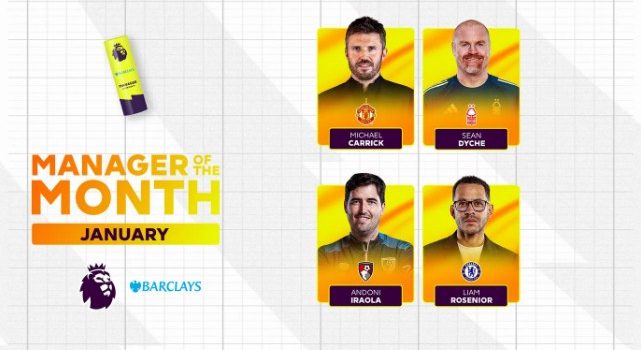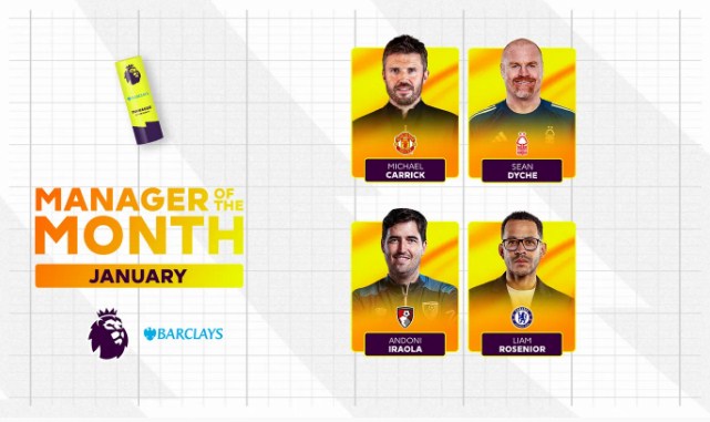 أعلنت رابطة الدوري الإنكليزي الممتاز عن قائمة المرشحين لجائزة أفضل مدرب في شهر يناير، والتي تضم اربعة مدربين تألقوا بشكل لافت