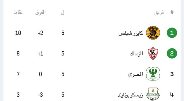 وفي المباراة الأخرى التي أُقيمت ضمن الجولة ذاتها حقق فريق زيسكو يونايتد الزامبي مفاجأة مدوية، بعدما فاز على ​الزمالك​ بهدف دون رد، ليقلب موازين المجموعة ويشعل الصراع على بطاقتي التأهل.