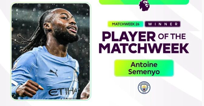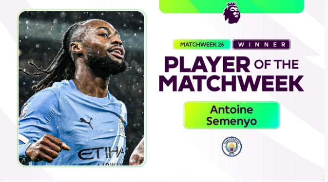وفاز الدولي الغاني أنطوان سيمينيو، لاعب الفريق الأول لكرة القدم بنادي مانشستر سيتي بجائزة أفضل لاعب بالجولة السادسة والعشرين من بطولة الدوري الإنجليزي.