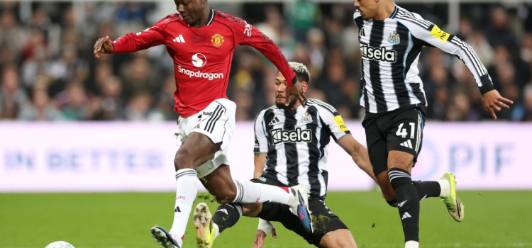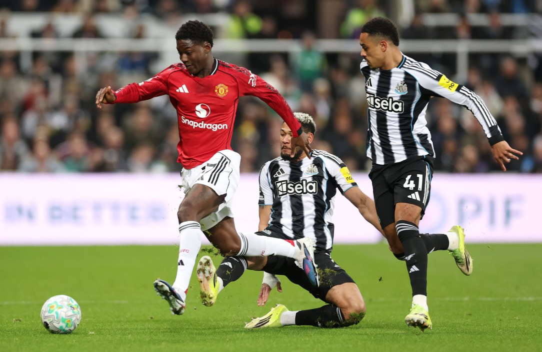 وفي الشوط الاول نجح لاعبو نيوكاسل يونايتد من فرض ايقاعه الهجومي على مجريات اللعب في ظل تمركز لاعبي اليونايتد في مناطقهم الدفاعية وضغط لاعبو الماكبايس بشكل كبير على مرمى الشياطين الحمر في محاولة لخطف هدف التقدم وكانت لهم العديد من المحاولات الخطيرو ولكن اللمسة الاخيرة غابت عنهم امام مرمى الخصم وبدوره حاول ابناء المدرب مايكل كاريك الاعتماد على الهجمات المرتدة ولكن خطورتهم كانت محدودة الى حد كبير، وواصل ابناء المدرب ادي هاو الضغط بقوة على مرمى اليونايتد وكان الماكبايس الاقرب الى خطف هدف التقدم ولكن الحظ عاندهم بشكل كبير وشهدت الدقائق الاخيرة اثارة كبيرة حيث تم طرد لاعب نيوكاسل جايكوب رامسي بعد تلقيه الانذار الثاني وفي الدقيقة 48 تحصّل نيوكاسل على ضربة جزاء انبرى اليها انطوني غوردن بنجاح ليمنح فريقه التقدم وبعدها نجح كاسميرو من خطف هدف التقدم لليونايتد في الوقت بدل الضائع بعد تمريرة حاسمة من برونو فيرنانديز لينتهي هذا الشوط بالتعادل الايجابي وبواقع 1-1.