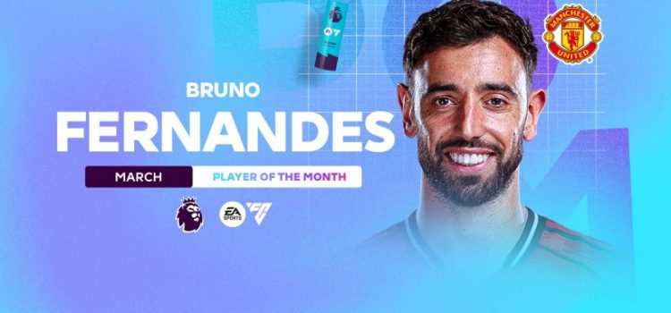 فاز برونو فيرنانديز، قائد مانشستر يونايتد، بجائزة أفضل لاعب لشهر مارس في الدوري الإنجليزي الممتاز، ليعادل ست جوائز زميله السابق كريستيانو رونالدو بعد شهر تألق فيه بتسجيل هدفين وصناعة أربع تمريرات حاسمة في أربع مباريات.