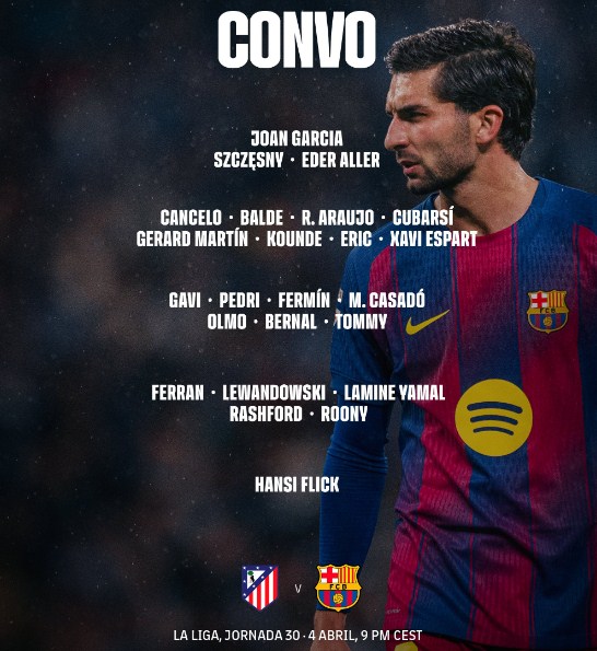 أعلن الألماني هانز فليك، المدير الفني لنادي برشلونة، عن القائمة الرسمية للفريق التي ستخوض مواجهة مرتقبة أمام أتلتيكو مدريد الليلة، لحساب الجولة الثلاثين من منافسات الدوري الإسباني.