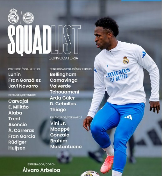 أعلن الإسباني ألفارو أربيلوا، المدير الفني للفريق الأول لكرة القدم بنادي ريال مدريد قائمة فريقه لمواجهة بايرن ميونخ ضمن منافسات دوري أبطال أوروبا.