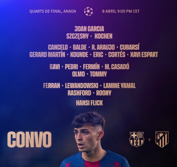 كشف مدرب فريق برشلونة هانز فليك عن قائمة الفريق المستدعاة لمواجهة أتلتيكو مدريد، مساء اليوم، في ذهاب ربع نهائي دوري أبطال أوروبا، على ملعب سبوتيفاي كامب نو.