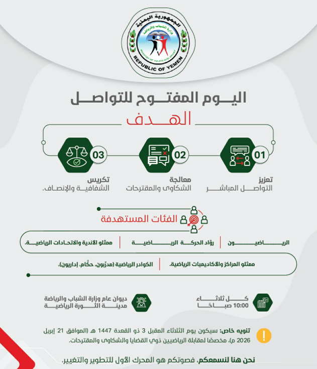 -سيكون يوم الثلاثاء المُقبل ٣ ذو القعدة ١٤٤٧ هـ، الموافق ٢١ إبريل ٢٠٢٦ م مخصَّصًا لمقابلة الرياضيين ذوي القضايا والشكاوى والمقترحات.