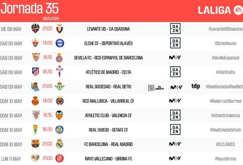 أزاحت رابطة الدوري الإسباني الستار عن مواعيد مباريات الجولة الـ35 من مسابقة “الليغا” والتي تتصدرها المواجهة المرتقبة بين ريال مدريد وبرشلونة في “كلاسيكو الأرض”.