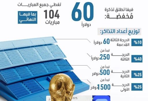 وطرح “فيفا” مجموعات جديدة من التذاكر للبيع يوم الأربعاء على موقعه الإلكتروني المخصص للتذاكر بلغ سعر التذاكر المتاحة للمباراة النهائية 10,990 دولارا أمريكيا.